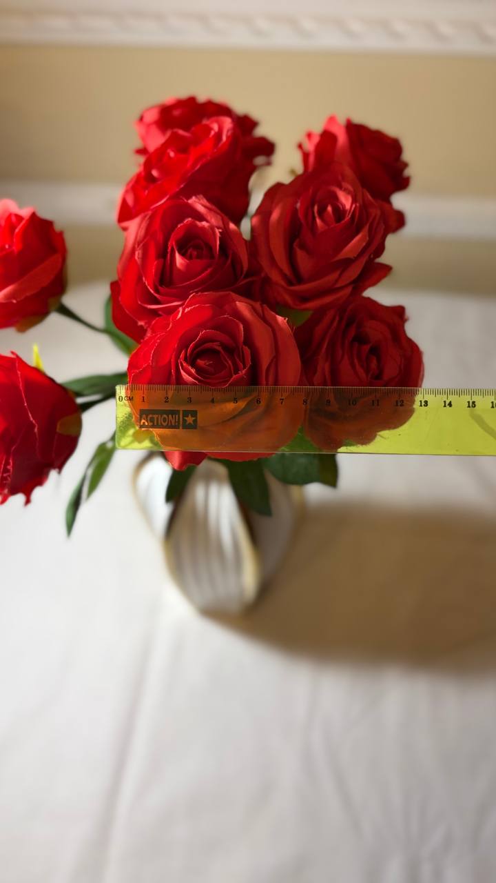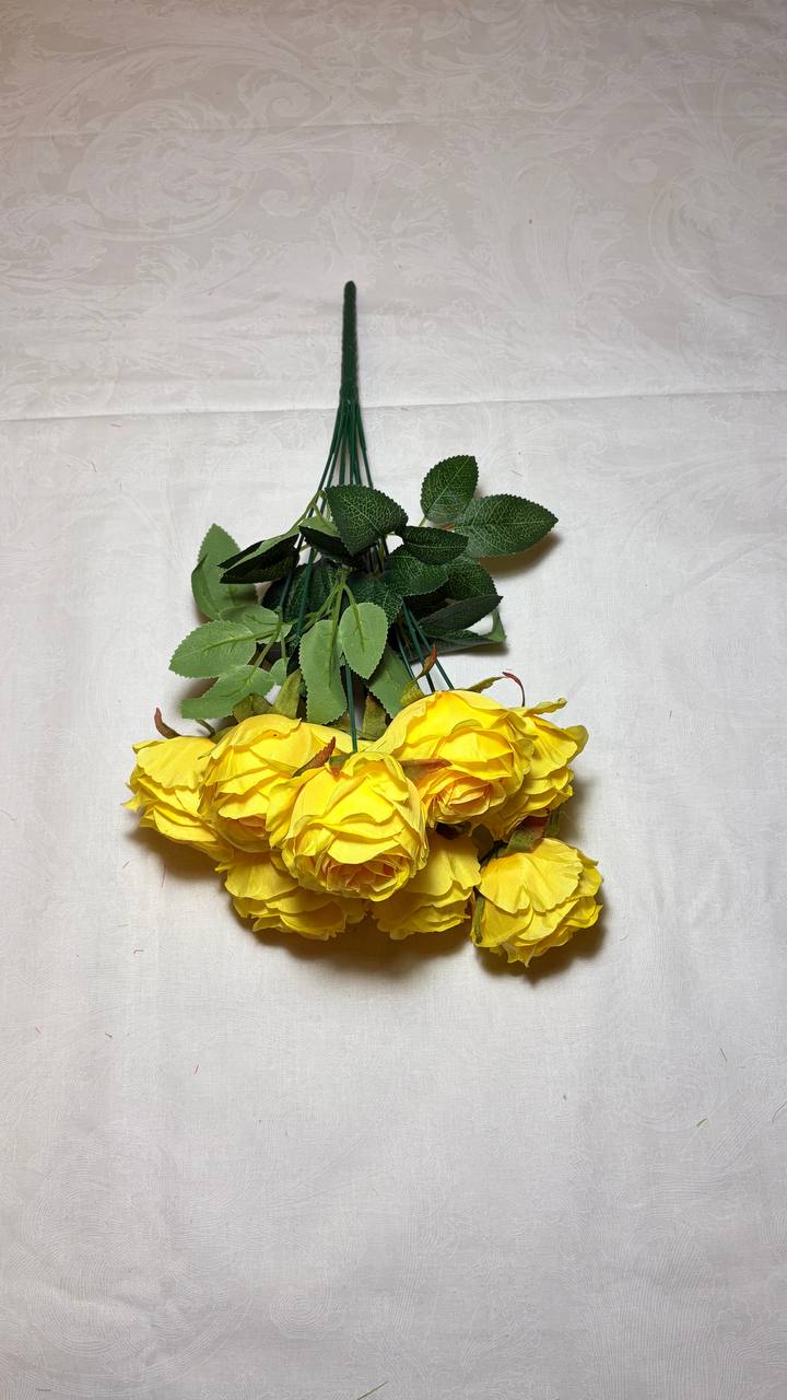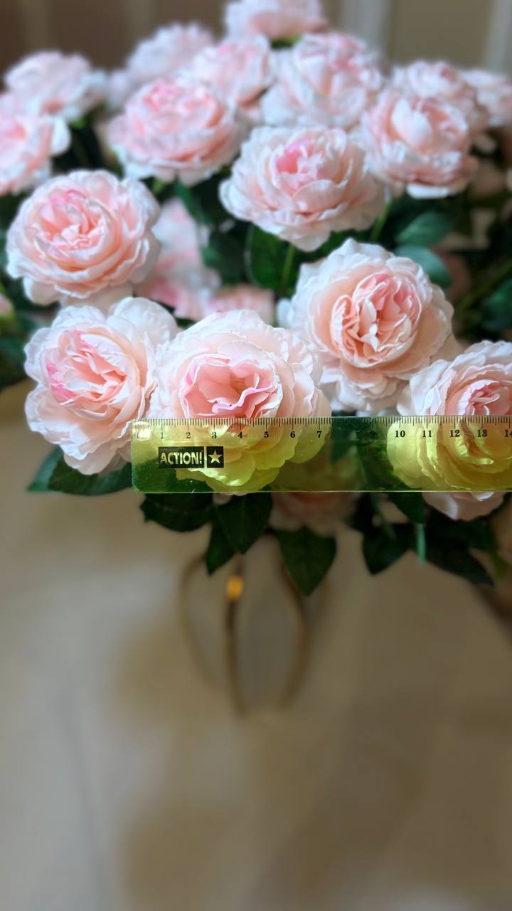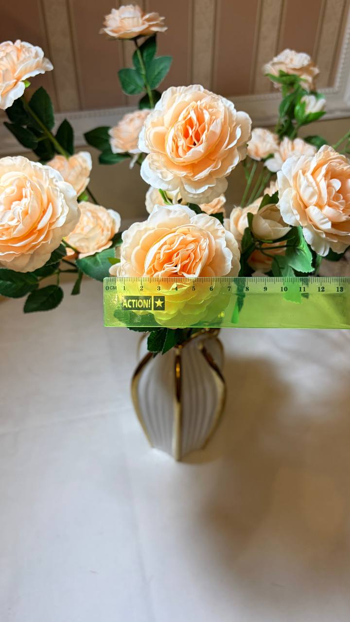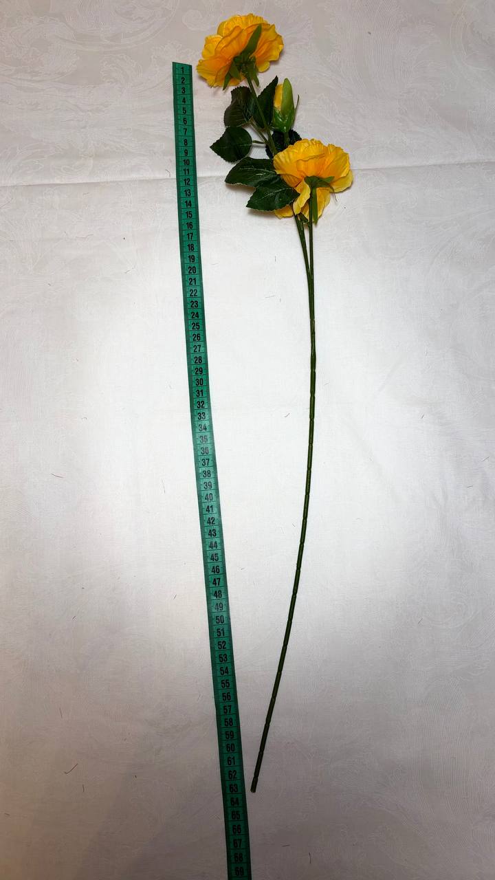 Букет состоит из 9 веточек. Цветы искусственные выполнены из прочного экопластика, а лепестки и листья — из плотной водоотталкивающей ткани. Высота букета — 44 см.