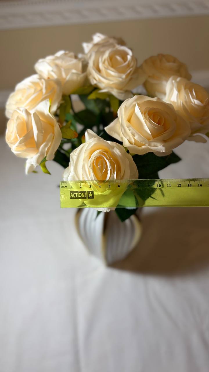 Букет состоит из 9 веточек. Цветы искусственные выполнены из прочного экопластика, а лепестки и листья — из плотной водоотталкивающей ткани. Высота букета — 44 см.